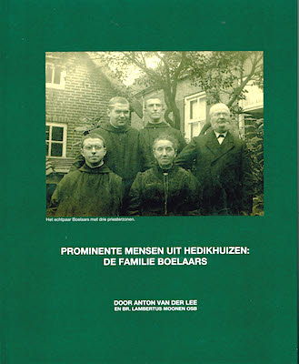 Anton van der Lee Prominente mensen uit Hedikhuizen. De familie Boelaars (Nieuwkuijk 2016) Korte samenvatting: Jozef Boelaars en de Lagere School van Hedikhuizen zijn vele jaren onverbrekelijk met elkaar verbonden. De school is 1843 gebouwd met subsidies van het Rijk en de Provincie. Een restant van het schoolgebouw bestaat nog, zij het dat het dienst doet als opslagruimte en dat het dak is verlaagd. De ernaast gelegen onderwijzerswoning, die in 1873 door familie Boelaars betrokken wordt, bestaat niet meer. Er is alleen nog een mooi schilderij bewaard gebleven. Josef Boelaars ’s-Hertogenbosch, volgt een onderwijzersopleiding en slaagt daarvoor op 19-jarige leeftijd. Zijn eerste standplaats als onderwijzer is Best, vervolgens Liempde en dan in Reusel. Hier leert hij zijn vrouw Kee Stevens kennen. Ze trouwen in 1873 en vestigen zich dan in Hedikhuizen. Hier wordt hij Hoofd van de School en blijft dat tot 1922 en is dan 60 jaar onderwijzer geweest. Het echtpaar krijgt in Hedikhuizen negen kinderen, waarvan er geen enkele trouwt. De oudste dochter Maria wordt non, zoon Jan wordt ambtenaar bij de Provincie, zonen Jozef en Harrie worden beeldend kunstenaar, zonen Bernard, Alois en Theodoor treden in bij de Benedictijnen en dochter Regina blijft ongetrouwd thuis. Een zoon overlijdt na zijn geboorte en een dochter overlijdt op 3-jarige leeftijd. In het boekje, met 64 pagina’s en een kartonnen kaft, is het prachtige familieverhaal uitgebreid omschreven en het is geïllustreerd met vele authentieke foto’s. |
